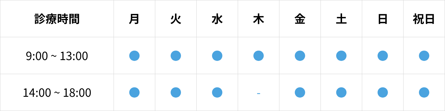 平日夜や土曜日も診療しているため、お仕事や学校帰りでも気軽にご来院いただけます。